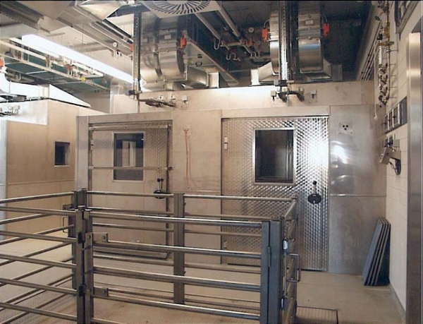 Ingenieurtechnische Besonderheit Respirationskammern Kernstück und Vorraussetzung für die Stoffwechselforschung sind die zwei Respirationskammern in denen Atemgaswechselmessungen für Aussagen zum Energieumsatz der Nutztiere durchgeführt werden. Diese Kammern wurden von Rekoplan Nord unter Berücksichtigung einer artgerechten, stressarmen Haltung entworfen, statisch bemessen und baubegleitend überwacht. Die konstruktive Ausbildung erfolgte als gasdichte Doppelkammer aus einer allseitig gitterartigen Tragkonstruktion aus seewasserbeständigem Edelstahlprofilen mit einer Dämmung und einer Innen- und Außenbekleidung aus Edelstahlbekleidung. Der Zugang erfolgt über ein Schleusensystem mit gasdichten, gedämmten Türen und Sichtfenstern, geeignet fürTemperaturen von bis zu 30K. Der Kammerboden aus Tränenblechen besitzt Aussparungen für eine quantitative Erfassung der Exkrementmengen die über Trichter in Edelstahlwannen aufgefangen und in den darunter liegenden Auffangraum für Laboruntersuchungen abgeführt werden. Die Tiere können je nach Bedarf über einen vormontierten Rinderstand aus V4A fixiert werden. Die Standlänge und Standbreite sind je nach Tiergröße variabel. Die Liegeflächen sind mit rutschfesten Gummimatten bestückt. Zur Simulation verschiedener Umweltbedingungen wurden die Kammern klimatisiert und eine Luftumwälzung realisiert, die die Gasschichtung in den Kammern verhindert. Die Frischluftversorgung erfolgt über Pumpensysteme, die eine variable Luftzufuhr von 5-30m³/h ermöglichen. Die Bestimmung des Sauerstoffverbrauches und der Kohlendioxid- und Methanproduktion erfolgt über Messung der Konzentration dieser Gase mittels Probenahmesystem. Eine Sicherheitsvorrichtung verhindert bei Ausfall der Frischluftpumpen den Erstickungstod der Tiere. Die Registrierung des Tierverhaltens und motorischen Aktivitäten erfolgt übermoderne Videotechnik und speziellen Sensoren. |